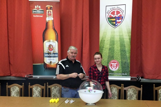 Unter Leitung des Vorsitzenden des Spielausschusses Dieter Fuhr wurde das Achtelfinale im Feldschlößchen-Pokal der Männer ausgelost. Bereits zur Tradition geworden ist, dass die Glücksfee der Auslosung aus dem gastgebenden Verein (SV Empor Walschleben) kommt. Es ist die Spielerin Julia Hamm. Alle Ansetzungen befinden sich im angehängten Dokument. Die Veröffentlichung erfolgt zeitnah unter FUSSBALL.DE. |