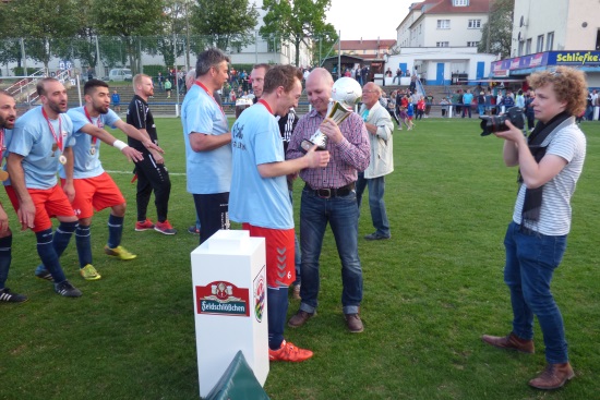 Wie schon im Vorjahr war dieses Endspiel auch dieses Mal gut besucht, zog es doch wieder 650 zahlende Zuschauer in die Grubenstraße. In der ersten Halbzeit sahen die zahlreichen Zuschauer ein packende Partie. Während der Kreisoberliga-Spitzenreiter optisch überlegen war, hatten die Kersplebener die besseren Chancen, welche aber allesamt ungenutzt blieben und es so torlos in die Kabine ging. Doch dies sollte sich nach der Pause ändern. In der Pause nutzte der KFA- Vorsitzende Jens Schenk die Gelegenheit, zwei Auszeichnungen für den Spieler Ferenc Friedrich (SpG An der Lache) für sein vorbildliches Fair Play-Verhalten und den ehemaligen Vorsitzenden des Jugendausschusses Carsten Helzig für seine Verdienste auszuzeichnen.