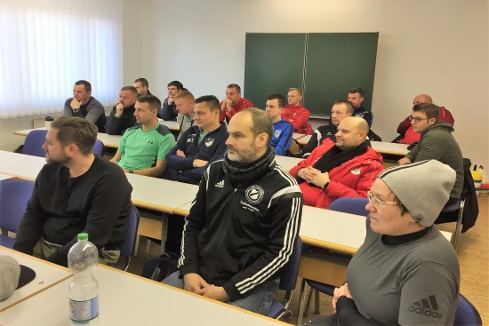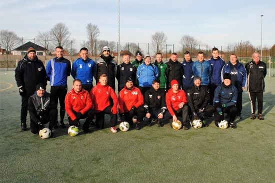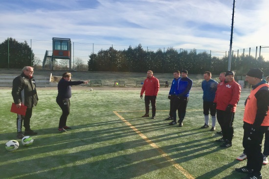 In der Zeit vom 11.01.-20.01.2019 nutzten 19 Trainer und eine Trainerin die tollen Bedingungen im Sömmerdaer Kurt-Neubert-Sportpark zum Erwerb der C-Lizenz. Unter der Leitung von Kreislehrwart Uwe Backhaus und Stützpunkttrainer Horst Grohmann (Ilmenau), hatten alle ein umfangreiches Programm zu absolvieren. Der Schwerpunkt in der Ausbildung lag dabei in der theoretischen und praktischen Schulung des 1-gegen-1-Verhaltens in Angriff und Abwehr. Die Teilnehmer waren vor allem begeistert vom großen Repertoire an Übungen und Spielformen, das von "Ede" Grohmann gewohnt launig in den vielen Praxiseinheiten präsentiert wurde. Aber auch in den Theoriestunden wurde eifrig über die vielen kleinen und großen Problemstellungen in unseren Vereinen diskutiert. Lehrgangsleiter Uwe Backhaus zeigte sich sehr zufrieden über den großen Zusammenhalt und Lerneifer der Gruppe und sprach vom besten Lehrgang, den die beiden Referenten in den 10 Jahren ihrer Tätigkeit im KFA Erfurt-Sömmerda bisher begleiten durften. Bemerkenswert war neben den herausragenden Ergebnissen von Katja Esche (FSV 1986 Bad Langensalza), Stefan Kranhold, Sascha Meißner (beide SV Empor Walschleben), Rene Zollitsch (Preußen Bad Langensalza) und Patrick Weigt (FC Rot-Weiß Erfurt) die Leistung vom 18-jährigen Nachwuchstrainer Peter Möller, der ebenfalls Mitglied des SV Empor Walschleben ist.