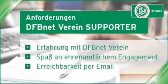 "DFBnet Verein SUPPORTER" sind erfahrene und überzeugte Anwender von DFBnet Verein, die neuen Nutzern mit Tipps und Tricks aus erster Hand zur Seite stehen. Sie werden von DFBMedien mit einer exklusiven SUPPORTER-Ausrüstung ausgestattet, persönlich geschult und können zudem am jährlichen SUPPORTER-Event teilnehmen, mit interessantem Rahmenprogramm - als Dankeschön für ihr ehrenamtliches Engagement.