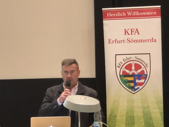 Während der Stimmenauszählung ergriff der aktuelle stellvertretende Vorsitzende des KFA Erfurt-Sömmerda, Roland Koch, das Wort und bedankte sich bei den anwesenden Schiedsrichtern für die geleistete Arbeit und freut sich auf eine noch intensivere Zusammenarbeit mit den verschiedenen Gremien in der Zukunft.
