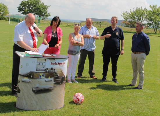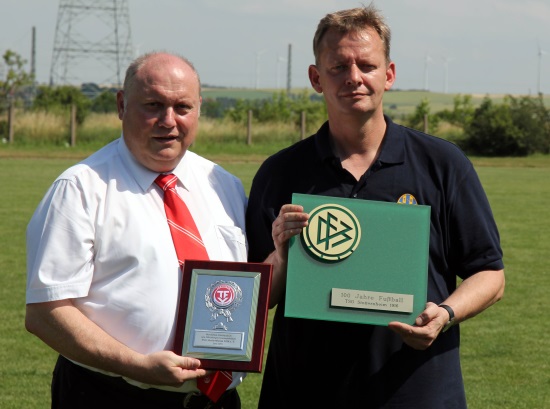 Frau Marion Walsmann und Frau Birgit Pelke vertretend für die Fraktionen und der Bürgermeister Stotternheims Gerhard Schmoock übergaben Prämien und bekräftigten ihrer Unterstützung des Vereins. Der Ehrenamtsbeauftragte Roland Koch und der Vorsitzende des KFA Erfurt-Sömmerda, Jens Schenk, überreichten dem Abteilungsleiter Fußball Sven Balven Bälle, das Ehren-Relief des Thüringer Fußball Verbandes verbunden mit einem Scheck und der Ehrentafel zum 100-jährigen Vereinsjubiläum des Deutschen Fußball Bundes. Wir wünschen dem Verein gutes Gelingen und weiterhin viele sportliche Erfolge.
