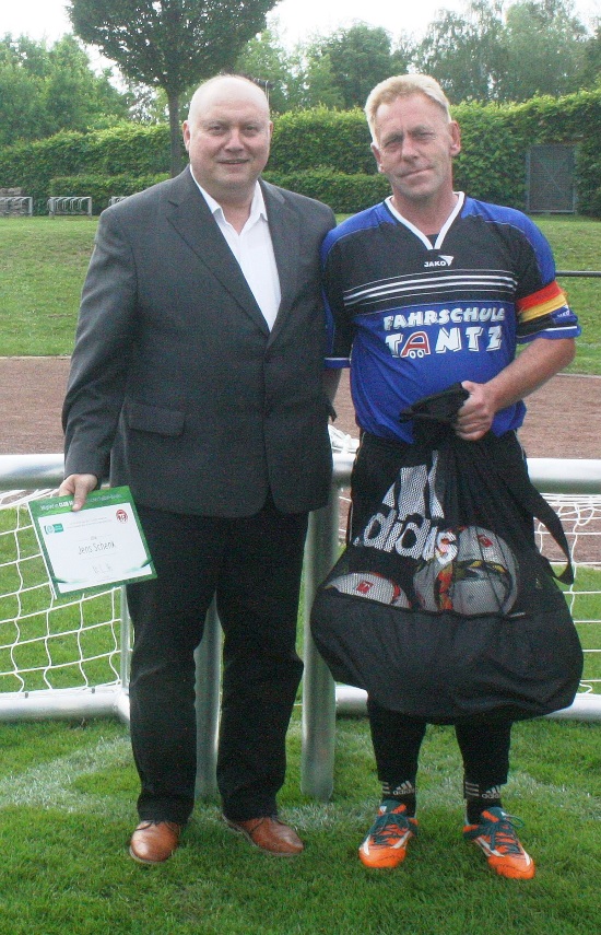 Denn der 1. Vizepräsident des Verbandes, Peter Brenn, übereichte dem ESV Lok im Beisein des Kreisehrenamtsbeauftragten, Roland Koch, beim Spiel der Alten Herren ESV Lok Erfurt - SV Empor Walschleben ein Ballpaket, zwei Minitore und eine personalisierte Tafel.