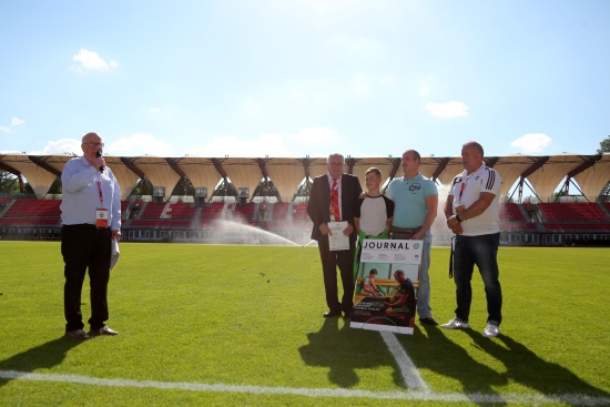 In der Halbzeitpause warteten auf Sven und Simon Seyfarth Peter Brenn, der 1. TFV-Vizepräsident, Mario Grund, Verantwortlicher für Handicap-Fußball, und der Verbandspressesprecher und langjährige Moderator des Finals, Hartmut Gerlach, im Innenraum.