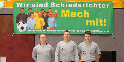 (03.01.) Die Schiedsrichter des KFA Erfurt-Sömmerda stellten mit einem großen Transparent bei den Turnieren in Sömmerda und Weißensee eine ganz besondere Aktion vor, unter dem Motto „Wir sind Schiedsrichter. Mach mit!" wollen sie um den eigenen Nachwuchs werben. „Ein solches Engagement ist in Thüringen einzigartig, vielleicht sogar deutschlandweit", lobte Jürgen Muscat vom Schiedsrichterausschuss des Thüringer Fußballverbandes.