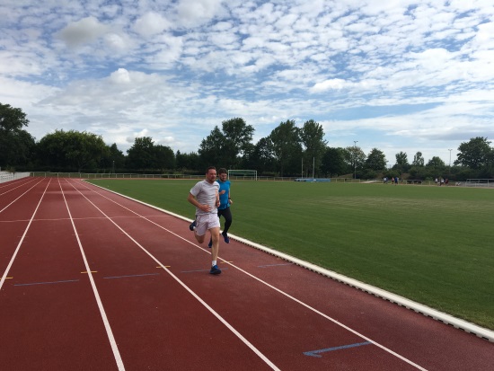 Nachdem Lehrwart Patrick Hofmann die Teilnehmer aus Kreisoberliga, Kreisliga und Nachwuchsgruppe begrüßte, ging es gleich zur Sache, denn die Fitnessüberprüfung war der erste Prüfstein des Tages. 12 Minuten am Stück laufen und dabei die jeweilige Norm für die Spielklasse erreichen. Damit nicht genug, mussten die Teilnehmer anschließend noch ihre Sprintfähigkeit unter Beweis stellen. Damit nicht alle der rund 30 Teilnehmer gleichzeitig auf die Laufbahn drängen, begann Gruppe 2 parallel mit dem Regeltest und wechselte anschließend auf die Bahn.